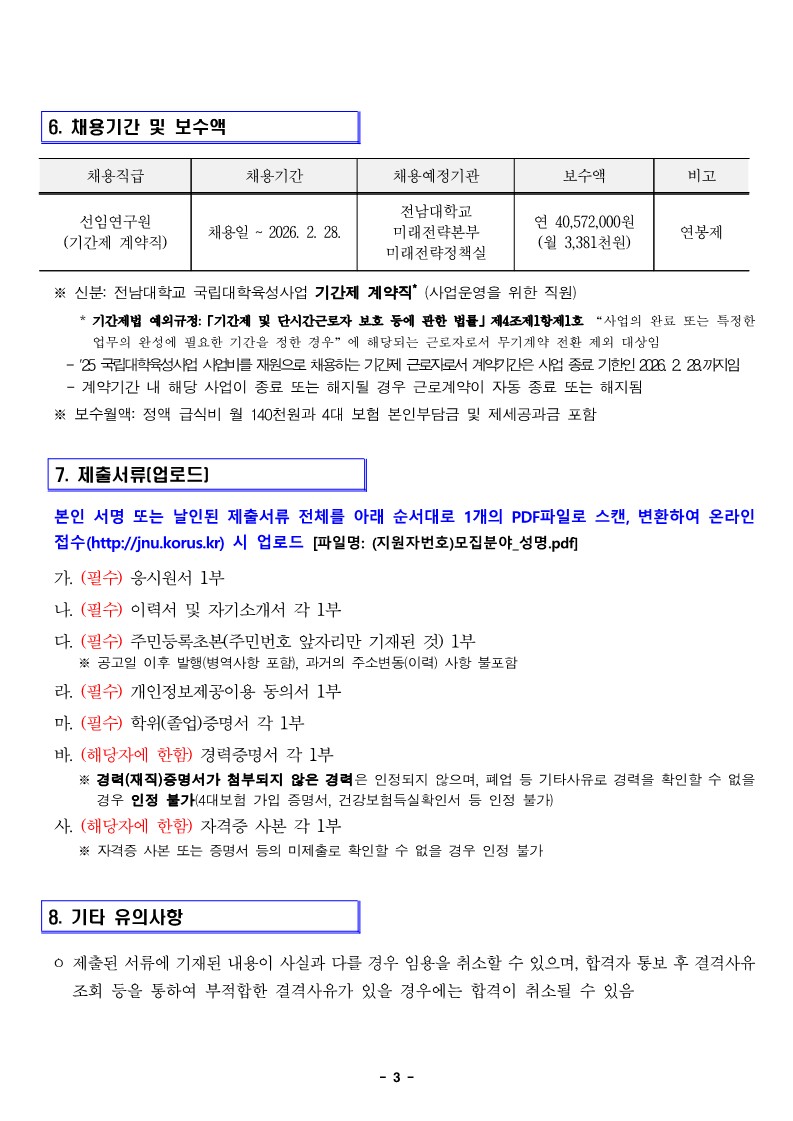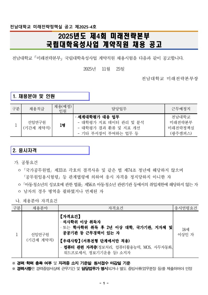 fnctId=bbs,fnctNo=1287 글번호 941142 전남대학교 미래전략본부 국립대학육성사업 계약직원(~12/5) 작성일 2025.11.26 수정일 2025.11.26 작성자 조은혜 조회수 114 첨부파일 02. 응시원서 및 작성양식.hwp 미리보기
