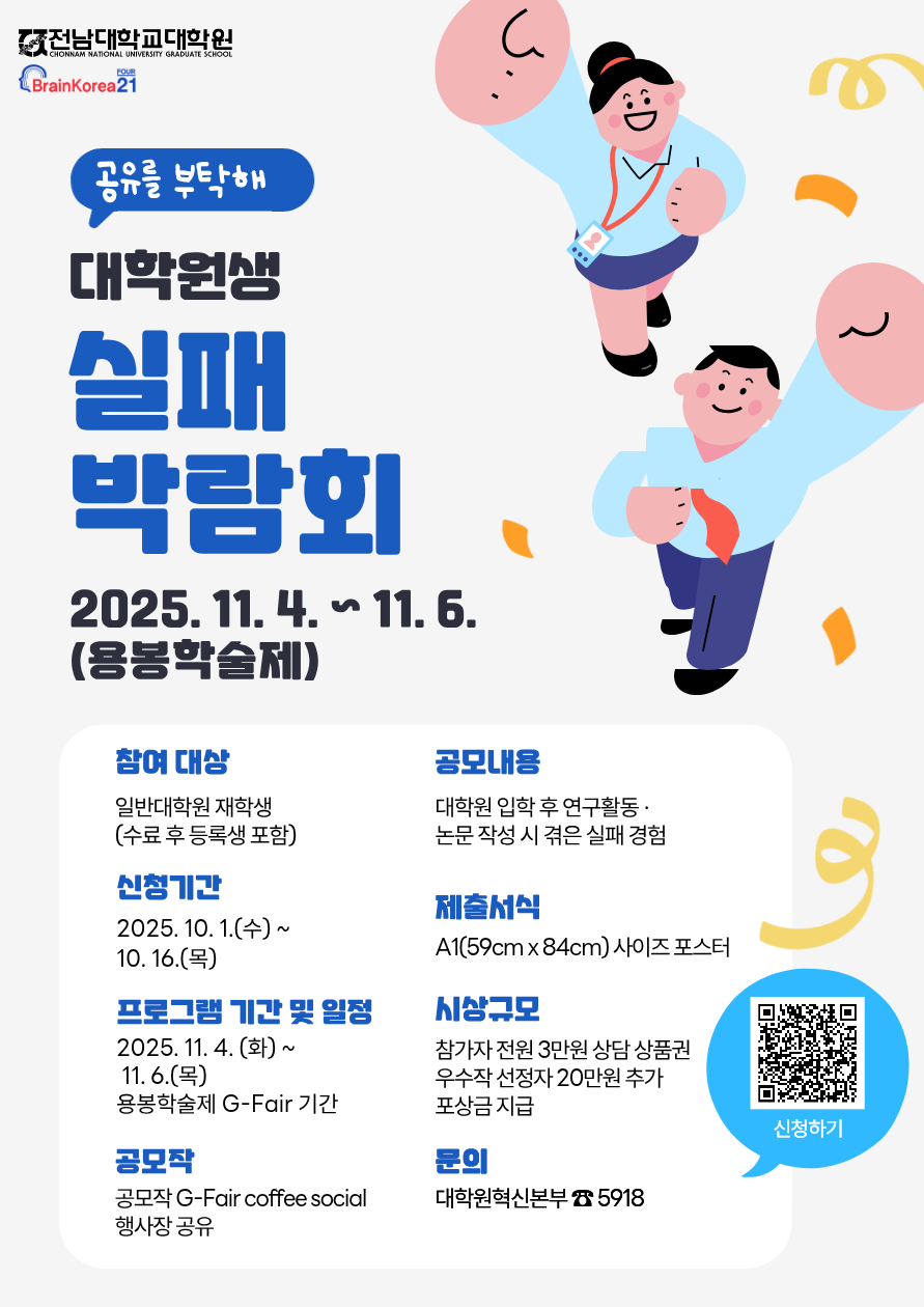 연구·논문수행 과정에서 실험 실패, 특허 무산 등 대학원 고유의 실패 유형 증가에 따른 심리적 안전감 저하를 방지하고 실패 사례의 체계적 공유를 통한 문제해결력 향상을 위하여 다음과 같이 「2025학년도 대학원생 실패박람회」를 개최하오니, 많은 대학원생의 참여 바랍니다.